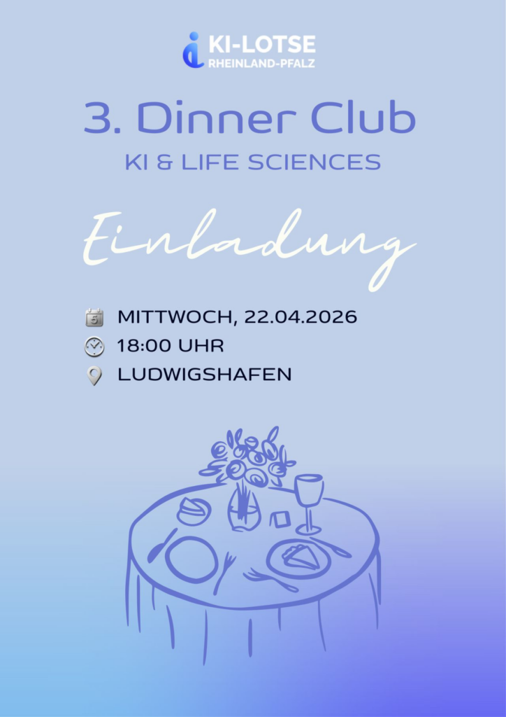 Zusammen mit Michael Hanf, Geschäftsführer des TZL-TechnologieZentrum Ludwigshafen am Rhein GmbH | Regionales Innovationszentrum Ludwigshafen, lade ich Sie herzlich zum dritten KI & Life Sciences Dinner Club in Ludwigshafen ein, bei dem sich Expert*innen aus den Bereichen Künstliche Intelligenz und Life Sciences in einem vertraulichen Rahmen austauschen können. Wir möchten einen Raum bieten für persönliche Gespräche und freuen uns auf neue Impulse, Vernetzungen und Synergien.